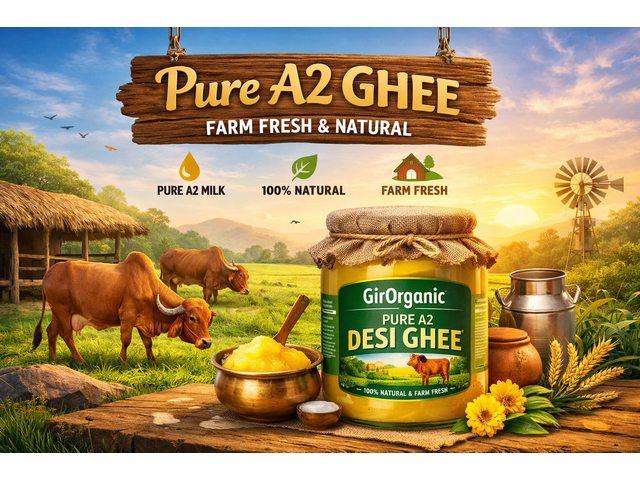 GirOrganic offers 100% natural A2 ghee online, crafted from pure Gir cow milk using the traditional Bilona method. Our ghee is rich in healthy fats, vitamins A, D, E, and K, making it a perfect addition to your daily diet. It improves gut health, strengthens immunity, and enhances flavor in every dish. With no additives or artificial processing, GirOrganic ensures unmatched quality and purity. Buy A2 ghee online now and enjoy the wholesome goodness of authentic desi cow ghee.