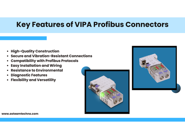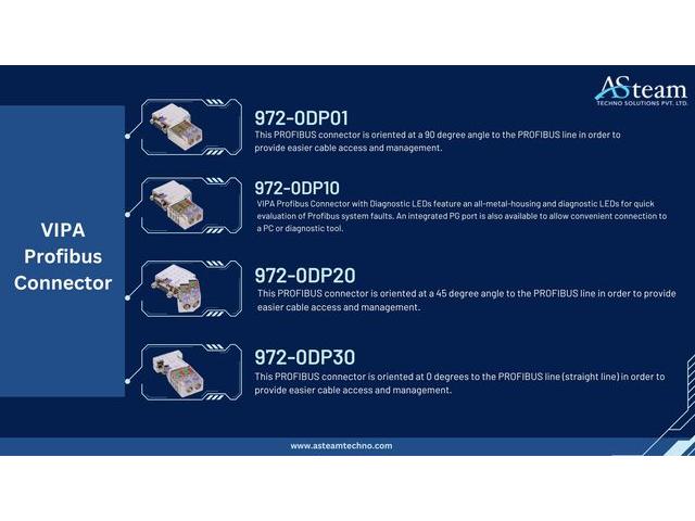 This VIPA 972-0DP01 Profibus Connector connects PROFIBUS user knots or complete PRO- FIBUS net components to the PROFIBUS line. Each connector has switchable terminating resistors. Dependent of the type of connector, a PD/diagnosis socket as well as a controller with 4 LED indicators are additionally integrated.