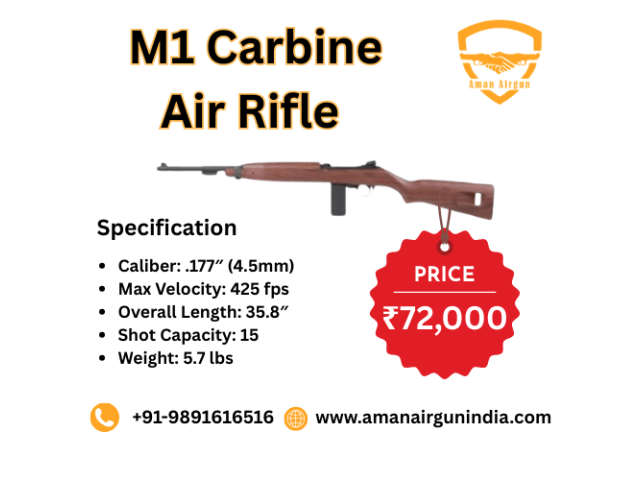 Battle-proven design meets precision air power — the M1 Carbine Air Rifle at just ₹72,000 delivers unmatched balance, rapid handling, and consistent accuracy for serious shooting enthusiasts. Offered by Aman Air Gun, this high-performance model is built for reliability, smooth cocking, and long-life durability. Perfect for collectors, target shooters, and professional users who demand authentic feel with modern engineering. Limited stock ensures higher resale value and exclusivity. Get verified quality, secure packaging, and expert support from a trusted name in air guns.