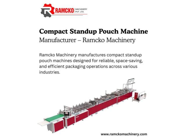 Ramcko Machinery is a reliable Compact Standup Pouch Machine manufacturer offering efficient and space-saving packaging solutions. Our machines deliver accurate pouch forming, strong sealing, and smooth operation for food and non-food products. Designed for durability and easy handling, they suit small and medium production units. Contact Ramcko Machinery for quality packaging machines at competitive value.