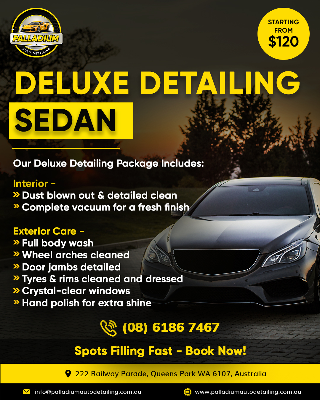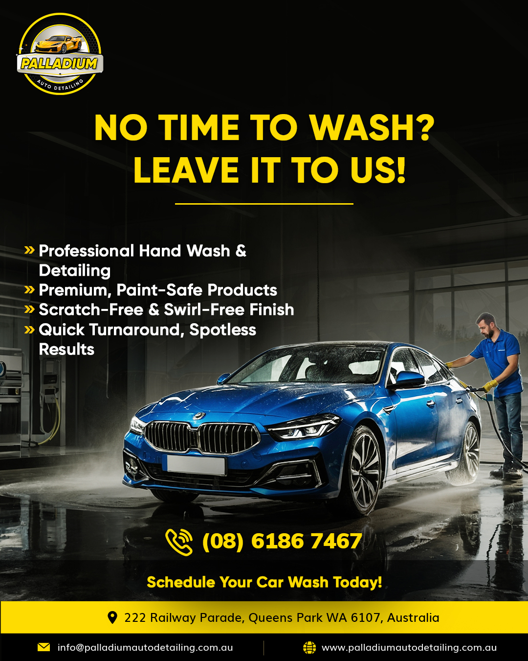 Palladium Auto Detailing is one of Perth’s top places for car wash and detailing services. We specialize in paint correction, ceramic coating, car polishing, and deep interior cleaning to make your car look like new again. Using safe and high-quality products, we remove scratches, swirl marks, stains, and odors while protecting your car’s paint for the long run. Whether you have a small car or a luxury vehicle, we provide honest prices and great care. If you’re looking for car detailing Perth or car wash Perth, Palladium Auto Detailing is the name you can trust to keep your car shining and looking its best every day.