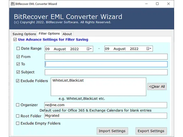 The expert-trusted and standalone BitRecover EML Converter Wizard is widely used to convert EML files into more than 35+ formats, including file and cloud services. The powerful tool enhances and simplifies user work by providing them with updated and advanced functionalities. The converter is unique in that it ensures the migration of data into the desired file format with intact data integrity. The interface of the EML file converter enhances productivity and is easy to use, even without technical skills.  Highlighted Features of The Professional Converter Import EML via Dual-Interface: It allows the user to load EML files by choosing either the Files or Folders option. The importing of EML files is secu...