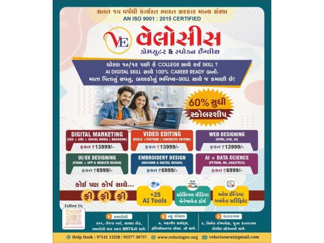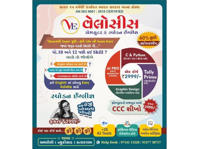 Velocis Computer and Spoken English Institute in Amroli Surat offers professional computer training for students and job seekers. Courses AvailableBasic Computer CourseCCC CourseMS Office and Advanced ExcelTally with GSTGraphic Design CourseSpoken English and Personality Development Why Choose UsPractical TrainingExperienced TrainersSmall Batch SizeAffordable Fees LocationAmroli Surat Students from Amroli Katargam Kosad Mota Varachha and Sayan can join easily. Contact now for admission and free course guidance.
