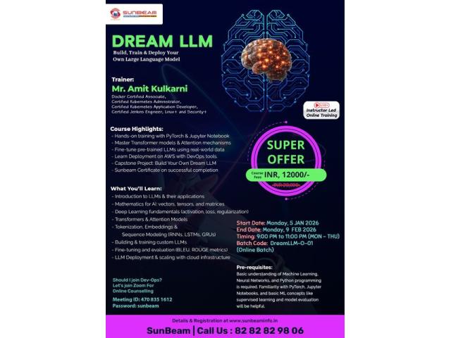 Enroll in SunBeam’s DREAM LLM Course and learn how to build, train, fine-tune, and deploy your own Large Language Model from scratch. This instructor-led online training includes hands-on experience with PyTorch, Jupyter Notebook, Transformers, Attention Mechanisms, and AWS deployment. Learn from Mr. Amit Kulkarni, an industry-certified expert in Docker, Kubernetes, Jenkins, Linux, and Security+. ✔ Hands-on practical training✔ Real-world LLM fine-tuning & deployment✔ Capstone project: Build your own LLM✔ Industry-recognized SunBeam Certificate ???? Start Date: 5 January 2026⏰ Timing: 9:00 PM – 11:00 PM (Mon–Thu)???? Mode: Online Batch???? Course Fees: INR 12,000/- (Limited Offer) ???? Ca...