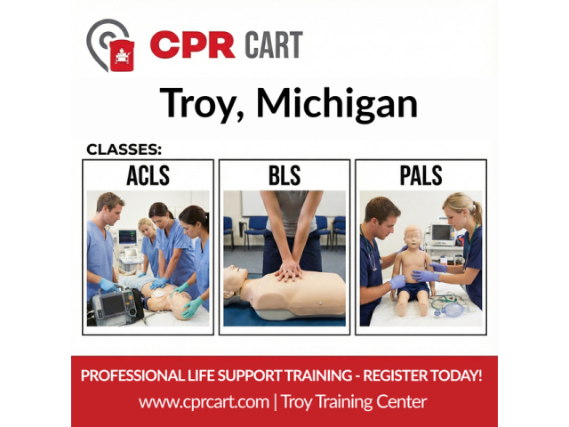 Get certified quickly with CPR Cart in Troy, Michigan. If you're looking for CPR certification in Troy, this program offers American Heart Association (AHA) approved BLS, ACLS, and PALS courses designed for healthcare professionals, students, and workplaces. Complete your training through a flexible blended format—finish the online portion at your own pace and complete a quick in-person skills check in under an hour. With same-day AHA eCards, 24/7 scheduling, and modern RQI skill stations, CPR Cart makes certification and renewal simple, fast, and reliable. Ideal for nurses, EMTs, medical students, and anyone needing compliant CPR credentials in Michigan.