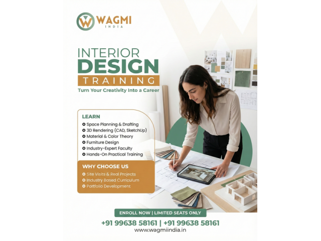 Wagmi India offers comprehensive Interior Design training that helps students understand space planning, 3D modeling, design concepts, materials, and project execution. The course is crafted to build both creativity and technical skills needed in residential and commercial design. Through hands-on projects and expert mentorship, students get industry-ready knowledge and confidence. Begin your interior design career with Wagmi India.???? +91 9963858161