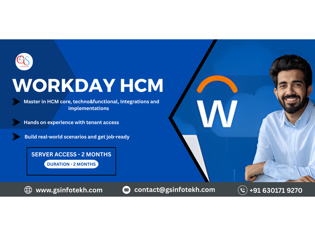 Workday HCM Course Online   GSInfotekh offers a comprehensive Workday HCM course online, designed to help professionals master Human Capital Management on the Workday platform. This course covers core concepts such as workforce planning, payroll management, and talent acquisition. Through hands-on training and real-time projects, learners gain practical experience in managing HR processes effectively. With flexible schedules and expert guidance, GSInfotekh ensures you build in-demand skills that prepare you for real-world challenges. Enroll in the Workday HCM course online and take a significant step toward advancing your career in human resource management and cloud-based solutio...