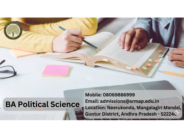 The BA Political Science course at SRM University AP offers a comprehensive understanding of political systems, governance, public policy, and international relations. The program combines theoretical knowledge with practical insights, helping students analyse political developments at national and global levels. With a focus on critical thinking, research, and communication skills, students are prepared for careers in civil services, public administration, journalism, law, and academia. The curriculum includes subjects like political theory, comparative politics, Indian government, and global politics, ensuring a well-rounded education aligned with current socio-political trends.