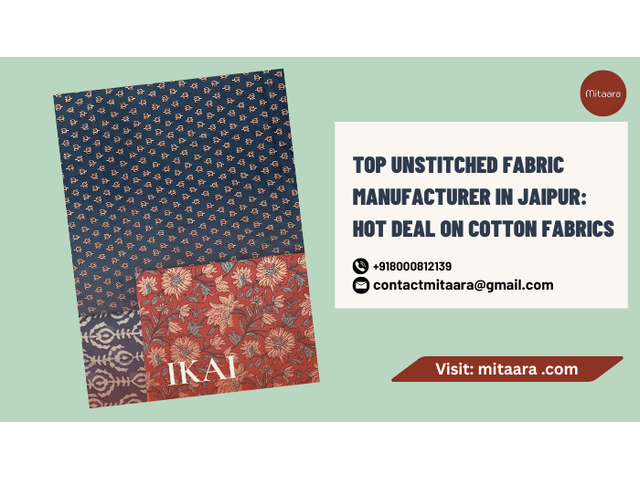 For boutique owners and fashion labels looking to stock up, finding a premier unstitched Fabric manufacturer in Jaipur is now easier than ever. Mitaara has established itself as a leading textile supplier in India, offering an extensive range of products that cater to the modern woman.  As best unstitched fabric manufacturer in Jaipur, They specialize in everyday cotton fabrics that are breathable, durable, and timeless, perfect for creating a best-selling collection. As a dedicated B2B fabric supplier, their focus on ethical textile sourcing ensures that buyers receive products made with integrity and care. They provides retailers flexibility to offer custom-fit options to their clients. The brand’s commit...