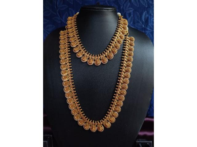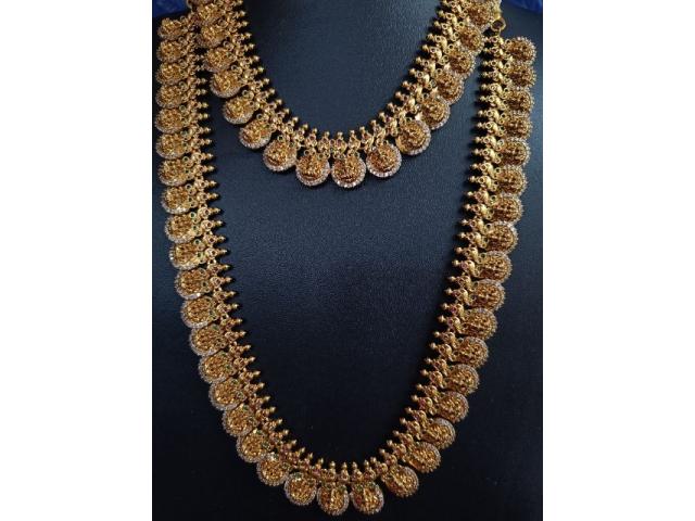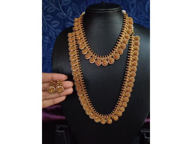 Elevate your ethnic look with this Antique Kasu Coin Combo Necklace Set featuring a long haram, short necklace & matching earrings. ???? Crafted with intricate Lakshmi coin motifs and a premium antique gold finish, this temple jewelry set adds royal charm to weddings, festive occasions & traditional celebrations. ???? Perfect for brides, bridesmaids & cultural events, this combo offers timeless elegance and long-lasting shine. A must-have for jewelry lovers who adore heritage-inspired designs. ✨???? vykuntstores.in