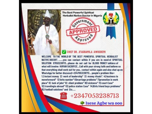 HELLO, I'M Chief Dr IFAGBAMILA AWOGBEMI THE SPIRITUAL MAN HELP PEOPLE WHO ARE INTERESTED IN MAKING MONEY WITHOUT HUMAN SACRIFICE INTERESTED CALL(+2347053238713) OR MESSAGE ME ON WHATSAPP IF YOU ARE NOT INTERESTED DON'T CALL ME OK   (1)MONEY RITUAL WITHOUT HUMAN SACRIFICE (2)LOTTO NUMBER (3)MAGIC RING TO DO ANYTHING (4)VISA APPROVAL (5)LOVE ME ALONE (6)PROMOTION AT WORK (7)EXAMS SUCCESS (8)HEALING POWER AND SEEING VISION FOR MEN OF GOD (9)DO AS I SAY (10)YAHOO + (11)FOR BUSINESS TO MOVE FASTER (12)BET NAIJA GAME TO WIN (1POWER TO WIN ELECTION 3)POLITICAL (14)CHILD PROBLEMS Call or Whatsapp me now (+2347053238713)