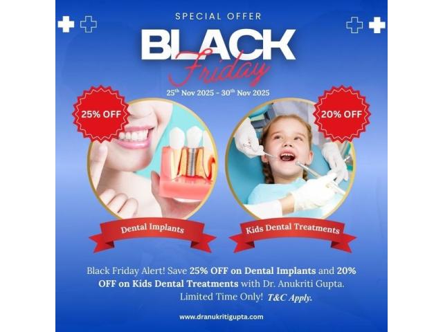 This Black Friday, save 25% OFF on Dental Implants and 20% OFF on Kids Dental Treatments with Dr. Anukriti Gupta- your trusted dentist in Gurgaon (Sectors 84, 86, 90, 91 & 92). Limited-time offer valid from 25th–30th Nov 2025. T&C Apply.