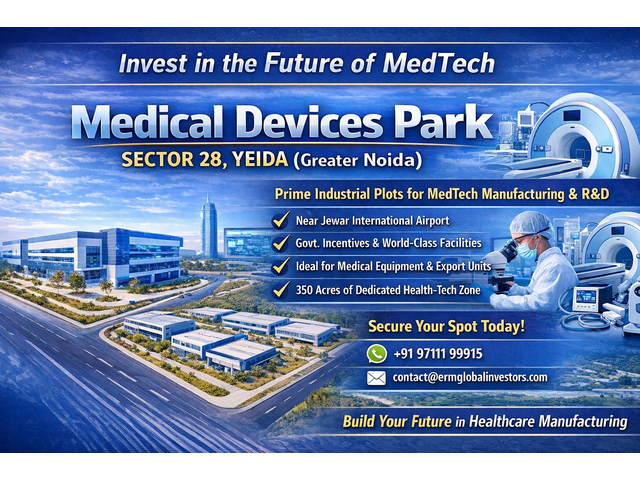 Unlock one of North India’s most strategic industrial property investments at the Medical Devices Park – Sector 28, YEIDA (Greater Noida). This 350-acre dedicated manufacturing and innovation zone is being developed under the Uttar Pradesh Medical Device Park initiative with strong government backing, world-class connectivity, and specialized infrastructure to support medical device production. Why Invest Here? ✅ Located just minutes from Noida International Airport (Jewar Airport) with excellent logistics and export potential. ✅ Designed as a fully integrated MedTech manufacturing ecosystem for imaging, diagnostics, oncology, implants, respiratory & cardio devices, and more. ✅ Supported by cent...