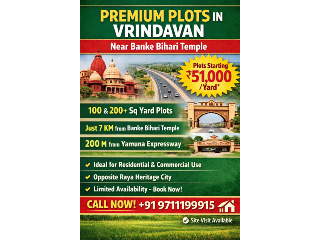 Premium abadi plot for sale in Vrindavan — 100 & 200+ sq yard plots starting ₹51,000/yard. Just 7 km from Banke Bihari Temple, opposite Raya Heritage City, and within 200 m of Yamuna Expressway. Ideal for residential, commercial, or agricultural use. Limited plots — contact for details!