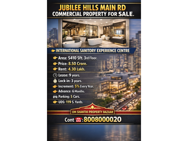 Sale of commercial property with INTERNATION SANITORY EXPERIENCE CENTRE tenants at Jubilee Hills Main road  ,Area:5410 sft, 3rd floor,Price:8.50 crs:Rent:4.30 lakhs,Lease:9 years,Lock in :3 Years,Advance:6Months,Increment:5% every year,Parking:5 cars,UDS:119 S.YARDS. Ours is OM SHANTHI PROPERTY BAZAAR... We are property dealers. We have so many properties in Greater Hyderabad all locations Like Retails Showroom, office Spaces, Banks, IT Companies, Mall in Spaces and Standalone buildings, our office is in Himayath Nagar for more details contact Us.