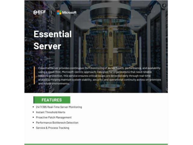 24/7 Essential Server Monitoring – Prevent Downtime & Secure Your Infrastructure Keep your servers secure and running smoothly with Essential Server Monitoring from ECF Data. For just $20, get continuous monitoring, real-time alerts, and proactive patch management for on-premise or hybrid cloud environments. Key Features:• 24/7 monitoring of CPU, RAM, disk, and network performance• Instant alerts for unusual activity or system issues• Proactive security patch management• Monitoring of critical services like SQL, IIS, and Active Directory Benefits:✔ Reduce costly downtime✔ Improve security and compliance readiness✔ Predictable monthly IT protection Trusted Microsoft Gold Partner with 13+ ...