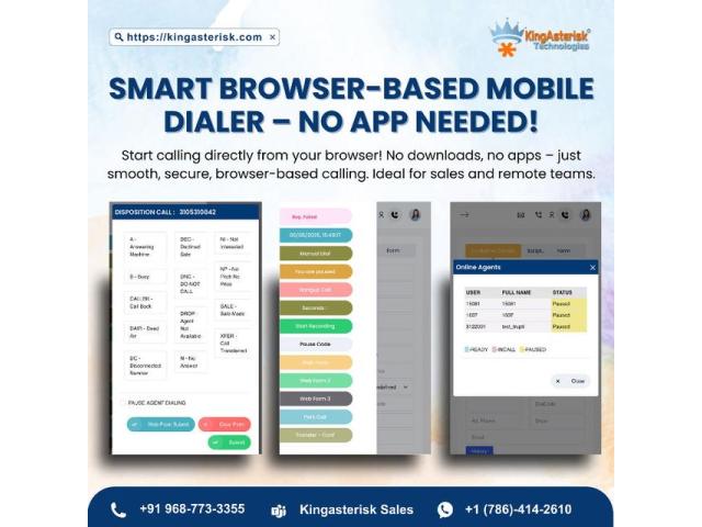 Frustrated with constantly downloading new calling apps? KingAsterisk Technologies offers a simpler solution: our browser-based mobile dialer works right in your browser! Start making calls directly from your Chrome or any other browser on your smartphone. That's right – no downloads, no apps needed! See How It Works: https://kingasterisk.com/solutions/browser-based-mobile-dialer • Start making secure, high-quality calls directly from Chrome or any browser on your mobile device.• Perfect for busy professionals and teams who want fast, simple, and reliable communication. Get ready for effortless, secure calling right from your phone – no extra apps needed! It's the ideal solution for busy professiona...