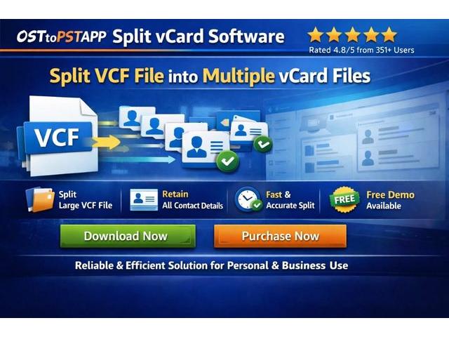 Manage big vCard files without stress. This safe and offline software splits contacts smoothly while keeping all details secure. Using the OSTtoPSTAPP split vCard tool, users are easily able to split individual VCF contact files into multiple small and large files without any file size limit, while the splitting process safely preserves contact information. names, phone numbers, email addresses, images, and other fields, and also maintain the original data without any changes. It can divide VCF files created from various platforms, such as iPhones, Android devices, Google contacts, iCloud, etc. Plus, this utility supports all vCard versions, such as 2.1, 3.0, and 4.0, which helps users to separate any version o...