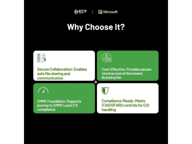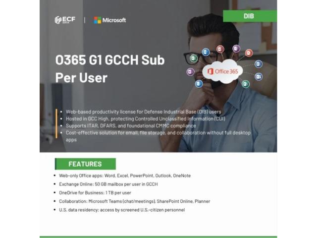 Strengthen your compliance and secure your operations with the O365 G1 GCCH Sub Per User license—now available from the ECF Cloud Solution Store at a competitive $15.50 per user.Perfect for DIB and aerospace contractors managing Controlled Unclassified Information (CUI) and needing a cost-effective GCC High solution for secure email, storage, and collaboration.