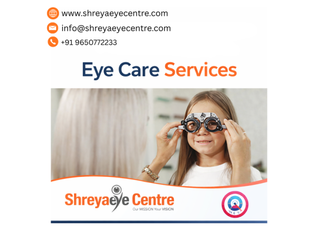 The image presents Eye Care Services which operate as a professional organization and show a child receiving a vision check-up from a hygienic and compassionate medical facility. The system shows modern eye testing methods which create a patient-centered experience because it uses advanced technology to provide early diagnosis and gentle treatment for children. The visual conveys trust, precision, and commitment to maintaining healthy vision through expert consultation and advanced eye care solutions.