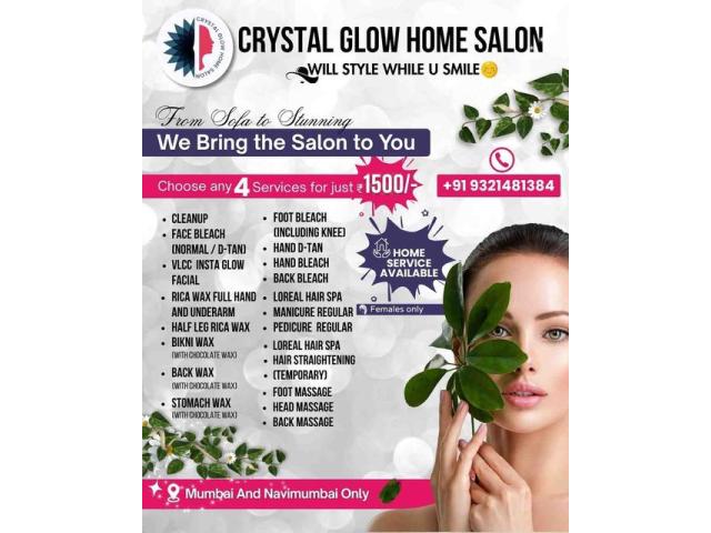 Crystal Glow Home Salon provides professional beauty services designed for comfort and convenience. All treatments are offered at your location, making it easy to maintain your routine without travel. Services are handled with care to match different skin and hair needs. The aim is to deliver consistent quality with hygienic practices. Each appointment is managed to give a smooth and reliable experience. Contact Us :-   9321481384 Timing :- 12 pm till 7 pm Everyday Email ID :-  crystalglow786@gmail.com Our Service Provide Under Rs 999/- Hair Spa Hair Straightening Foot Massage Head Massage Back Massage Facial Face Bleach Back Bleach Hand Bleach Hand Bleach Hand D -Tan Full Hand and Undera...