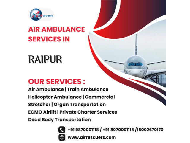 We offer quick and trustworthy air ambulance services in Raipur, available 24 hours a day for emergencies. Our aircraft feature modern medical facilities, and our expert medical staff delivers high-quality care at every stage.Benefits: ⚡ Swift Response ???? Advanced Medical Technology ????⚕️ Expert Medical Team