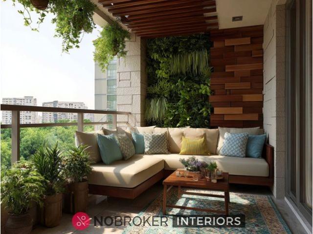 Explore premium interior design inspiration featuring lush vertical garden balconies, marble kitchen countertops, wooden headboards, and spa-like bathrooms. Transform your living space with sophisticated, high-end decor solutions from NoBroker Interiors.