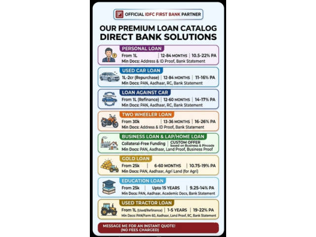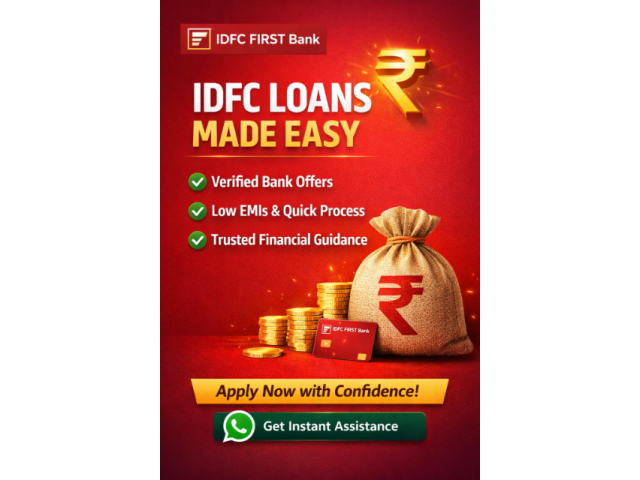 As an Official IDFC FIRST Bank Partner, we provide professional financial solutions with complete transparency. Get an instant Personal Loan starting from 10.5% PA with flexible repayment tenures ranging from 12 to 84 months. Our process is 100% digital and paperless, designed for quick approval without visiting a branch. Product Features: Loan amounts starting from ₹1 Lakh. Interest rates from 10.5% to 22% PA. No hidden charges or high-interest app fees. Documents Required: Valid Address & Identity Proof (Aadhaar/PAN). Recent 6-month Bank Statement. Eligibility Check: Simply reply to this ad with your PINCODE to check your direct bank offer in just 2 minutes. We ensure a secure and professional ...