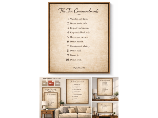 10 Commandments Wall Art Canvas – Christian Home Decor, Vintage Scripture Print, Religious Wall Art Bring faith, inspiration, and timeless elegance into your home with this beautifully designed 10 Commandments Wall Art. Featuring a classic vintage parchment background and clean typography, this Christian wall decor serves as a daily reminder of God’s Word and biblical values. Perfect for living rooms, bedrooms, prayer spaces, churches, or offices, this religious artwork blends faith and style effortlessly. Ideal as a meaningful Christian gift for families, pastors, housewarmings, or special religious occasions. Available as high-resolution digital print files, ready for easy printing and framing to match...