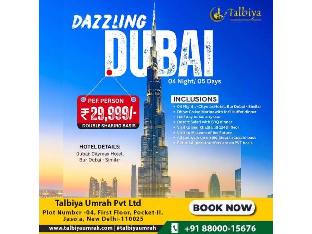 Looking for the best Dubai tour package from India? Book this exclusive 04 Nights / 05 Days Dubai holiday starting at just ₹29,999 per person (Double Sharing Basis). Enjoy a perfect mix of adventure, luxury, and sightseeing with our specially curated itinerary covering Dubai’s top attractions. The package includes stay in a premium hotel, Dubai city tour, Dhow Cruise Marina with international buffet dinner, thrilling Desert Safari with BBQ dinner, and a visit to the world-famous Burj Khalifa (124th Floor). You will also explore the Museum of the Future, one of Dubai’s most iconic experiences. Airport transfers and tours are arranged on SIC/PVT basis for complete convenience.