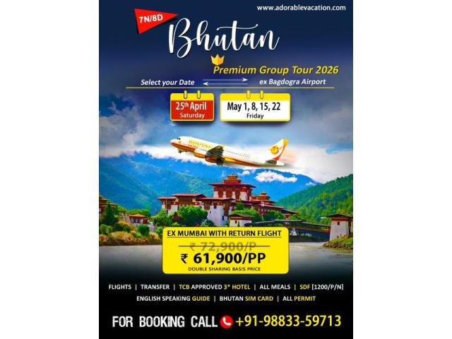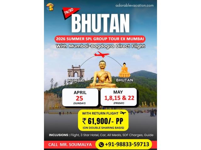 Book Amazing Bhutan Package Tour from Mumbai with Adorable Vacation - No 1 Agency for Bhutan tour from Mumbai. Experience a hassle free journey as you take in stunning mountain views, explore historic monasteries, and enjoy authentic local experiences. Book your Bhutan package tour from Mumbai today and turn your dream vacation into a reality.Like every year, this year also Adorable Vacation is offering all inclusive Bhutan Package Tour from Mumbai with Flight. The dates for Bhutan package with airfare from Mumbai are 25th April, 1st May, 8th May, 15th May and 22nd May 2026. Mumbai to Bhutan Package Duration: 7N | 8DDestinations Covered in Bhutan tour package from Mumbai: Phuentsholing 2N| Thimphu 2N | Pun...
