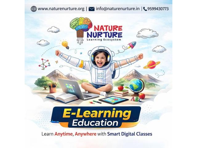 This image highlights modern e-learning education, showcasing a joyful child exploring knowledge through smart digital classrooms. It represents how technology-driven learning makes education engaging, interactive, and accessible anytime, anywhere. The visual reflects creativity, curiosity, and innovation, emphasizing the power of digital tools to nurture young minds and support future-ready learning experiences.