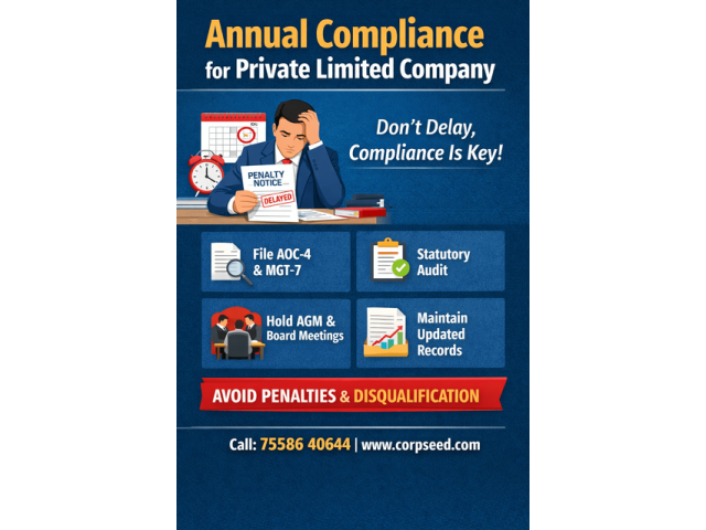 ROC compliance for pvt ltd company is essential to ensure legal continuity and avoid penalties under the Companies Act. Corpseed provides expert guidance on annual ROC filings, AOC-4, MGT-7, director disclosures, and statutory compliance timelines. Trusted by startups and growing companies across India, Corpseed focuses on accuracy, regulatory clarity, and timely compliance support. For expert assistance, call +917558640644.visit:  https://www.corpseed.com/service/annual-compliance-for-private-limited