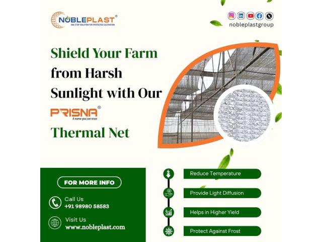 Protect your farm from extreme sunlight and temperature fluctuations with NoblePlast PRISMA Thermal Net. Designed for modern protected cultivation, this advanced thermal net helps reduce excess heat while ensuring uniform light diffusion across crops. It creates an ideal growing environment that supports healthy plant growth, improves yield quality, and protects crops from frost and harsh climatic conditions. Suitable for greenhouses, polyhouses, nurseries, and open-field farming applications.