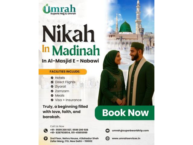 Begin your new journey with blessings in the holy city of Madinah.Celebrate your Nikah in Al-Masjid an-Nabawi, a truly once-in-a-lifetime spiritual experience filled with love and faith.Package Includes:Nikah ceremony in MadinahFull Umrah package (Visa, Flights, Hotels, Transport)Private Nikah setup with official documentationZiyarat tours in Makkah & MadinahContact Now:-Company Name: Superb Umrah Packages- Complete Makkah, Madinah Umrah TourAddress: 2nd Floor, Nehru house, Bahadur Shah Zafar Marg, ITO, New Delhi, Delhi 110002Call us:- 09599200927 Website:- https://www.umrahservices.in/nikah-in-medina.html